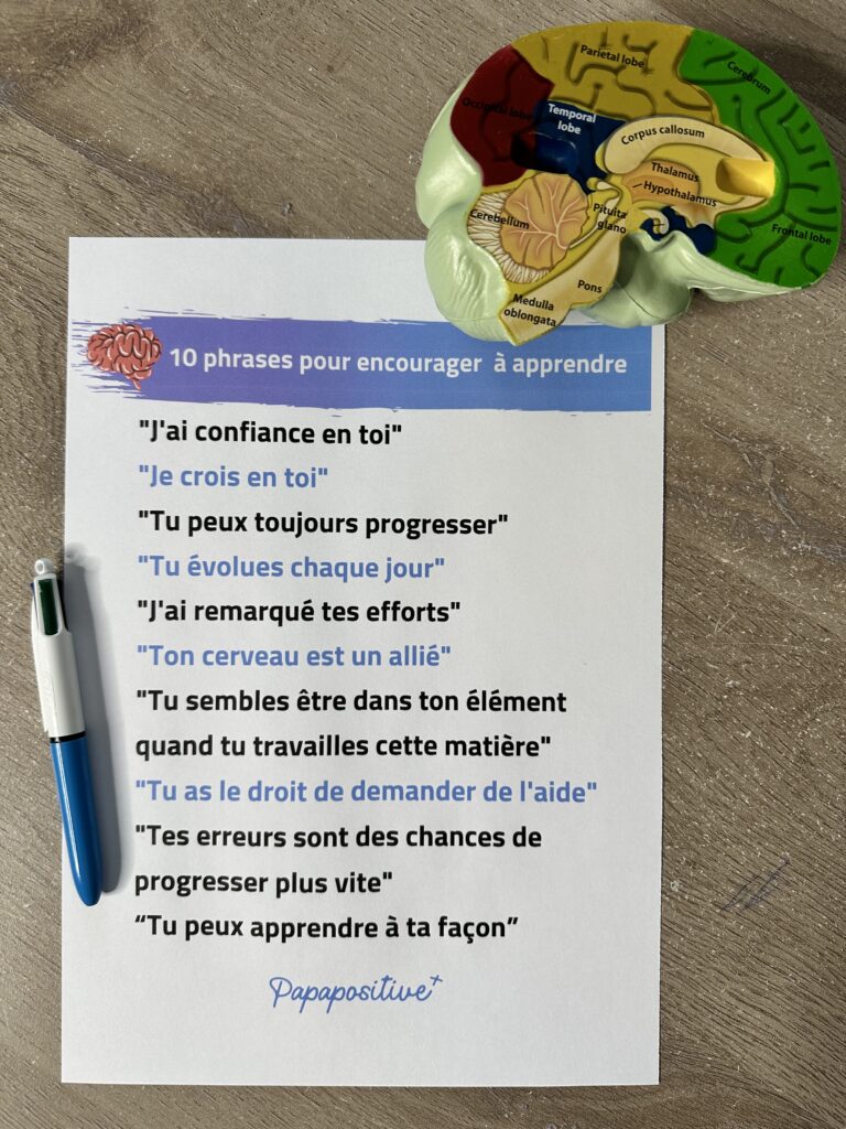 Télécharge le visuel avec ces 10 phrases pour l’afficher à la maison ou à l’école et répandre des encouragements positifs partout où il y a des apprentissages !