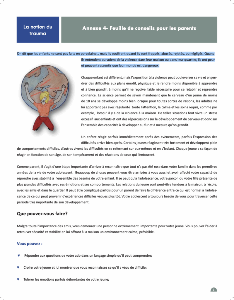 Cette trousse, bien qu’orientée vers les intervenants psychosociaux, peut aussi servir aux enseignants et parents. Elle favorise une compréhension commune du trauma et propose des actions simples pour soutenir la résilience des jeunes.