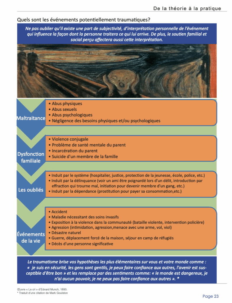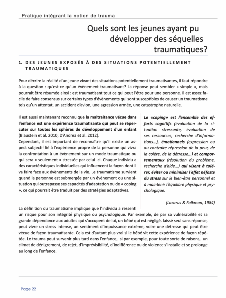 Le document rappelle qu’un trauma ne se résume pas à l’événement, mais à l’impact qu’il a sur le développement global du jeune. Deux adolescents exposés à la même situation peuvent réagir différemment selon leurs ressources, leur histoire et leur environnement.