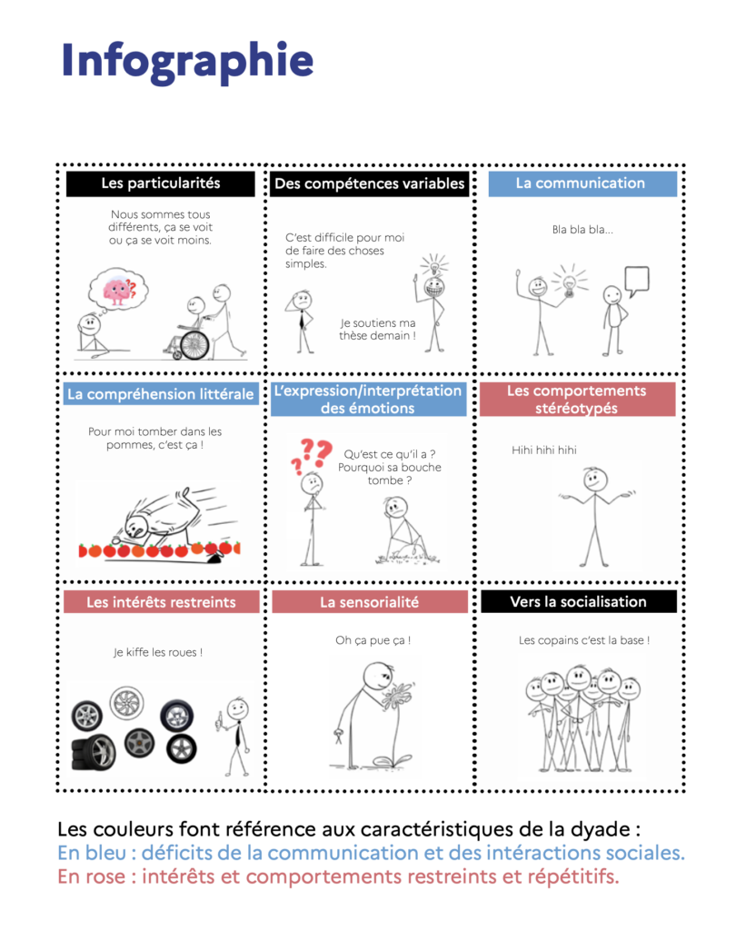 - Des repères clairs : Des infographies simples pour mieux comprendre les particularités du TSA (communication, sensorialité, intérêts restreints) et le concept de « théorie de l’esprit ».