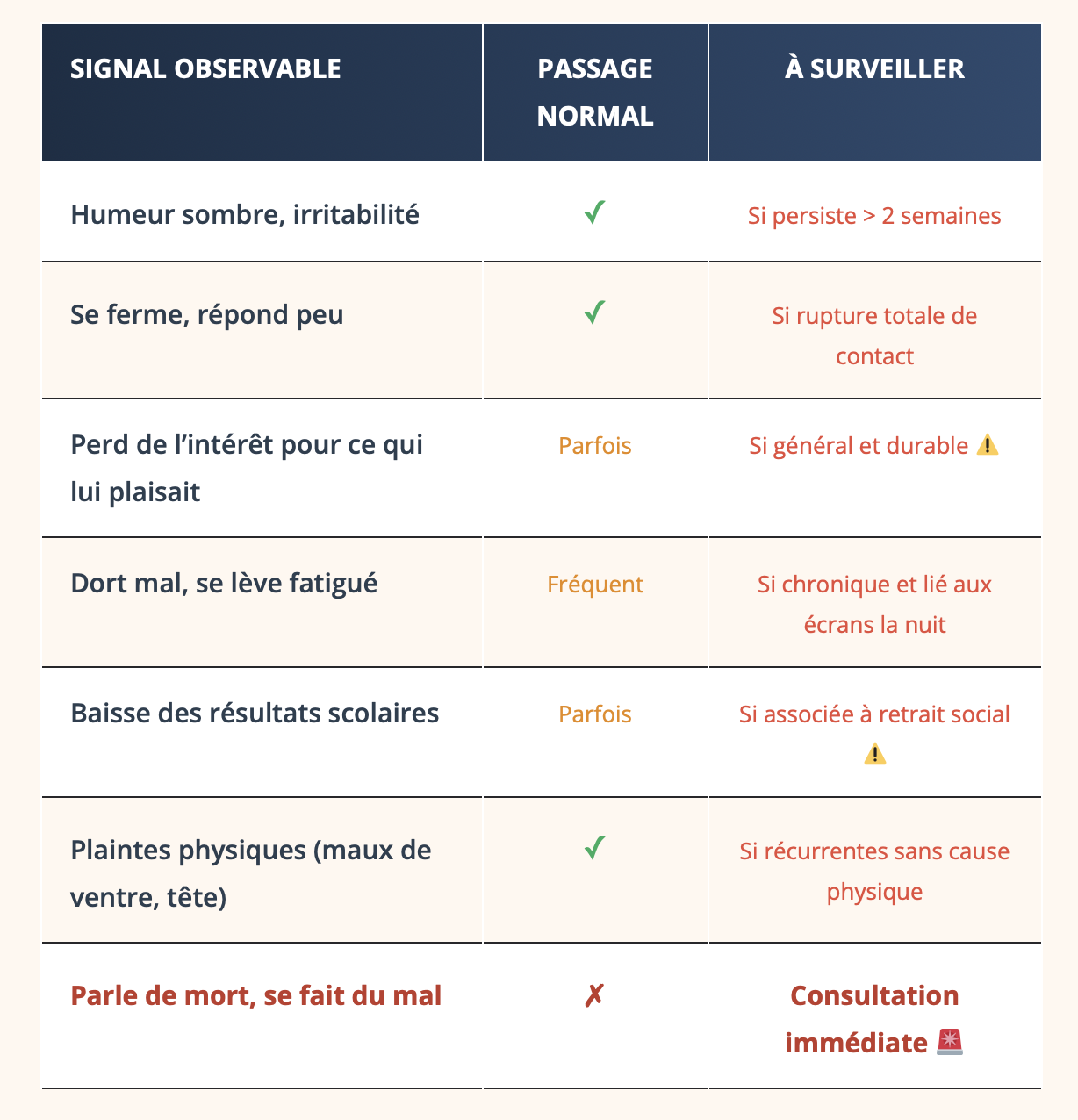 La difficulté avec la souffrance psychologique adolescente, c’est qu’elle se déguise souvent. Ce n’est pas forcément des larmes — c’est parfois le contraire. Voici les signaux que les spécialistes recommandent de surveiller, en distinguant ce qui est normal de ce qui mérite attention.